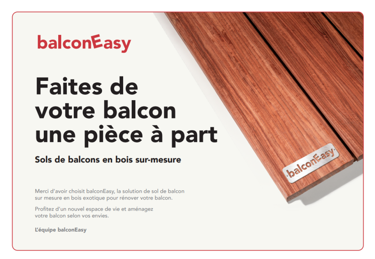 BALCON EASY ass eng Mark vun der Lëtzebuergescher Firma ADWIRE. Hiert Konzept si Buedemverkleedungen aus exoteschem Holz déi op d’Mooss gemaach sinn. Dat ganzt funktionéiert online iwwert hire Site, wou een déi genau Dimensioune kann agi fir direkt e genaue Präis ze kréien.