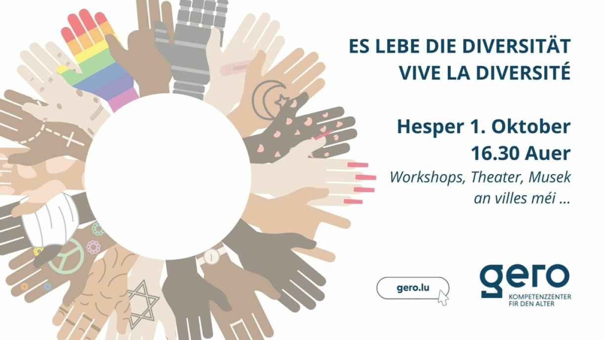 Op Initiativ vum Familljeministère organiséiert de GERO den Dag vun der Diversitéit den 1. Oktober zu Hesper am CELO. Um 2 mëttes ginn et schonn 2 Ateliere proposéiert an den offiziellen Haaptdeel fänkt um 16.30 Auer un. Do gëtt et e flotte Programm mat Musek an Theater wou d’Stereotyppe vum Alter mol sou richteg ausernee geholl.