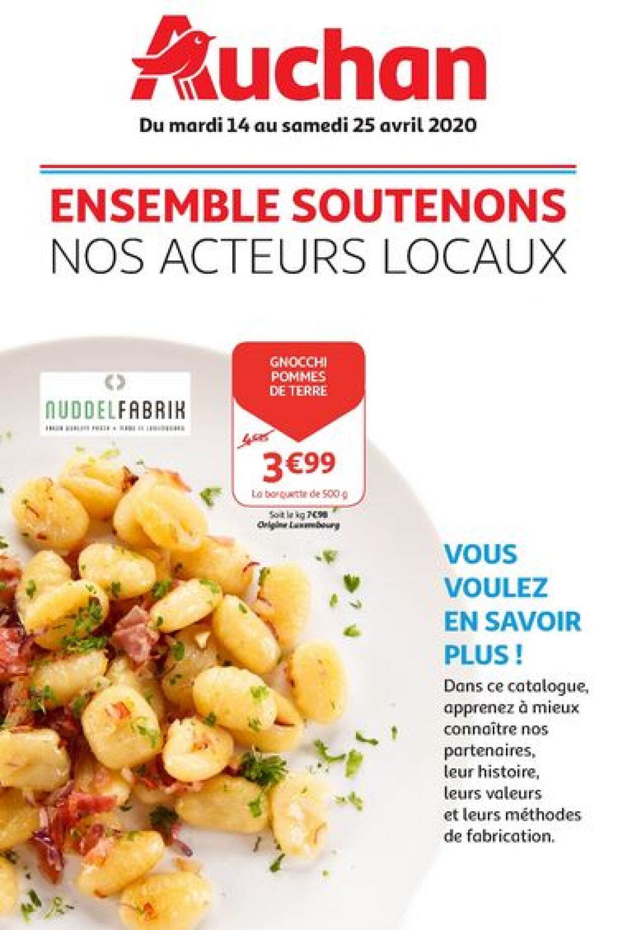 Am aktuelle Flyer erënnert den Auchan drun, dass de Supermarché eis lokal Acteuren ënnerstëtzt. All Dag fann Dir an Ären Auchan-Butteker lëtzebuergesch an nohalteg Produite aus der „Filière responsable Auchan“, déi Qualitéit, Zeréckverfollegbarkeet an och eng fair Bezuelung fir d’Produzente garantéieren. Op Lëtzebuerger Säit sinn dat zum Beispill d’Produkter vun der Cobolux, aus de Salaisons Meyer, der Provençale, der Nuddelfabrik, vu Panelux, Grosbusch, vun der “Ferme de Drauffelt”, vun der Klengbettener Millen, d’Wasser Lodyss, d’Produkter aus der Moutarderie de Luxembourg, den Hunneg vun der Marque Nationale, d’Kichelcher vu Schwan an d’Wäiner aus den Domaines Vinsmoselle. All d’Auchan-Mataarbechter sinn am Asaz, fir dass Dir och weiderhi sécher akafe kënnt. Duerfir: respektéiert weg d’Distanzen a bezuelt wa méiglech mat der Kaart. Dir fannt d’Ëffnungszäite vun Ärem Geschäft op auchan.lu! Moies tëscht 8.00 an 9.00 hu Leit iwwer 65 Joer, déi mat engem Handicap, schwanger Fraen an d’Personal aus de Flegeheemer a Spideeler Prioritéit beim Akafen!