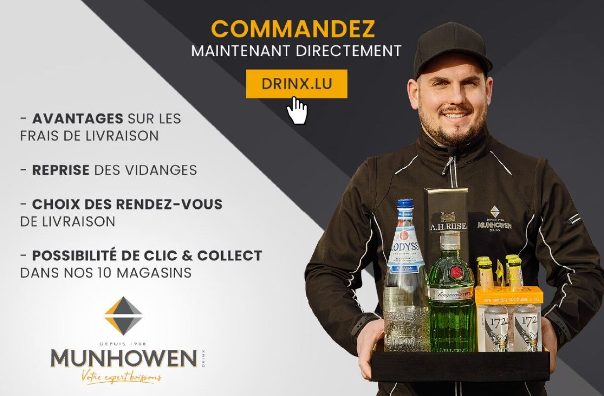 Munhowen huet elo en neien e-commerce-Site fir den Drinx lancéiert. Et gi mëttlerweil 10 Drinx-Geschäfter uechter d’ganzt Land an elo hu si sech also am Verkaf iwwer Internet nei opgestallt, fir der aktueller Demande nozekommen. Elo kann ee sech säi Gedrénks an e puer Klicken heem liwwere loossen, ouni Minimum fir d’Bestellung! www.drinx.lu proposéiert iwwer 1.000 Referenzen am Waasser, Soft Drinks, Béier, Wäin an Alkohol.