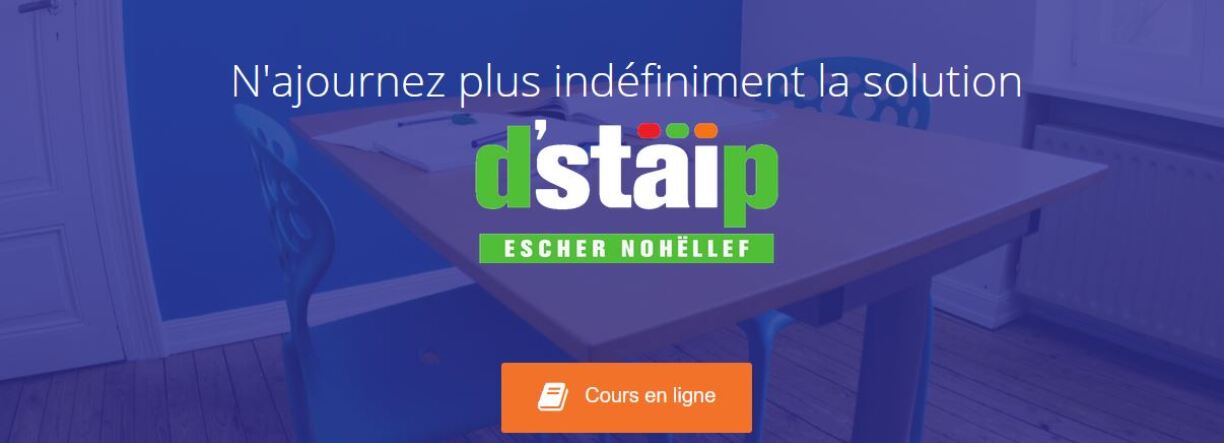 d’stäip, déi Escher Nohëllefschoul, ass zanter 25 Joer do fir d‘Schüler aus dem Fondamental an aus dem Secondaire mat Nohëllef an alle Fächer fir all Niveau. An och an der Corona-Kris ass hir Equipe prett fir d’Schüler an den nächste Woche bei hiren Aufgaben, Projetën a virun allem der Preparatioun op de Premières-Examen ze ënnerstëtzen: an dat online natiirlech, sief et am Eenzelunterricht oder zu puer an enger Konferenz. Kontaktéiert si ganz einfach iwwer de Site www.d-staip.lu an da klickt Dir do op „Online-Kueren“! d’stäip vun Esch an all hir Mataarbechter wënschen alle Schüler a Studente vill Courage beim Léieren, an denkt drun: d‘stäip hëlleft !