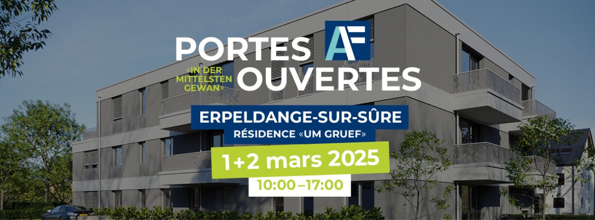 Arend & Fischbach luet Iech dëse Samschdeg a Sonndeg häerzlech an op hir grouss Porte Ouverte vum Lotissement «In der mittelsten Gewan» zu Ierpeldeng un der Sauer. Vun 10 Auer Moies bis nomëttes 5 Auer kënnt Dir 3 schlësselfäerdeg Wunnengen an der Residenz «Um Gruef» entdecken.