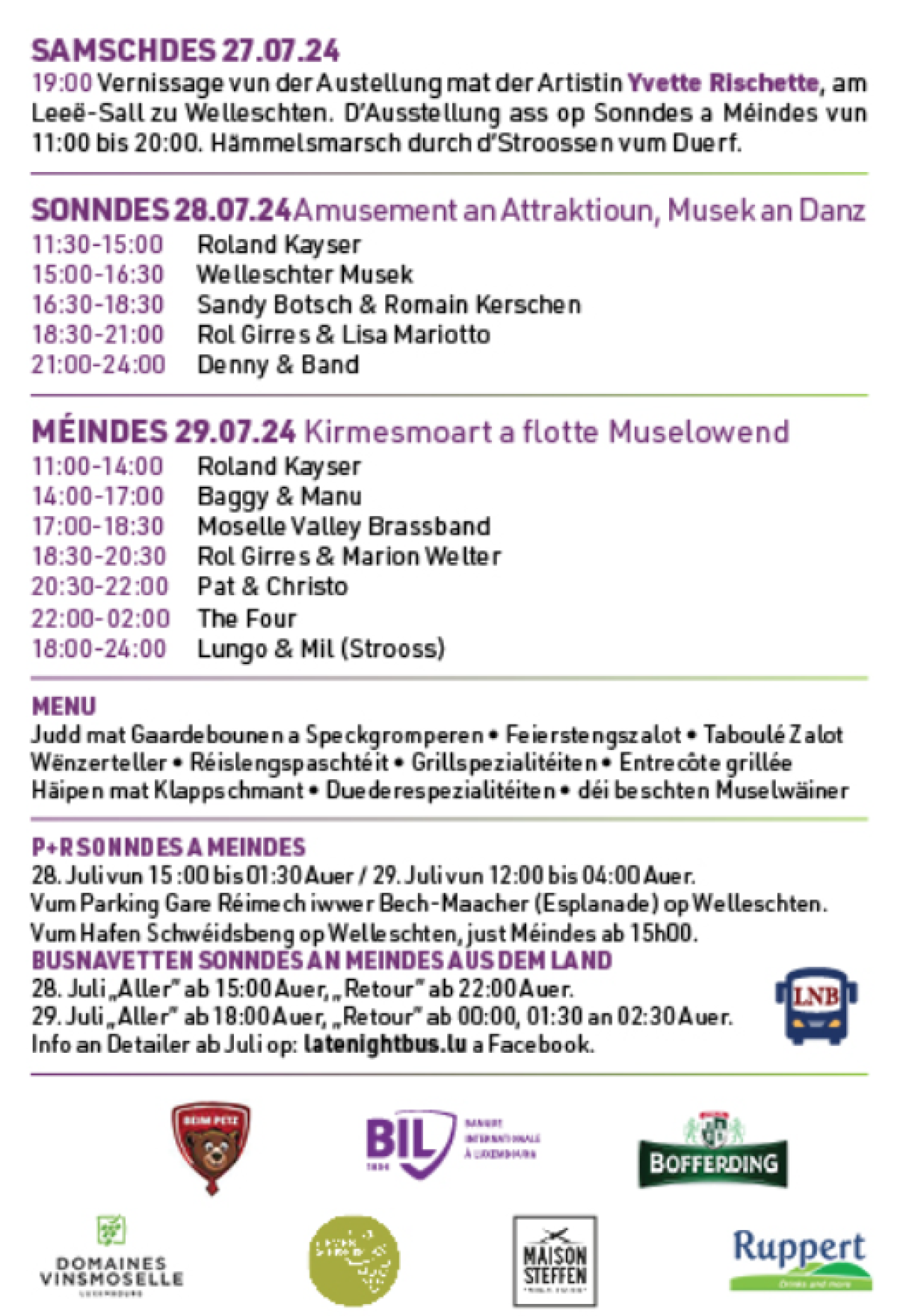 Vun 12 Auer Mëttes geet et zu Wellesteen an der Gemeng Schenge lass. Iwwert déi zwee Deeg gëtt et dann Danzmusek, lokal Spezialitéiten an dat geet dann och scho mol bis déif an d’Nuecht.