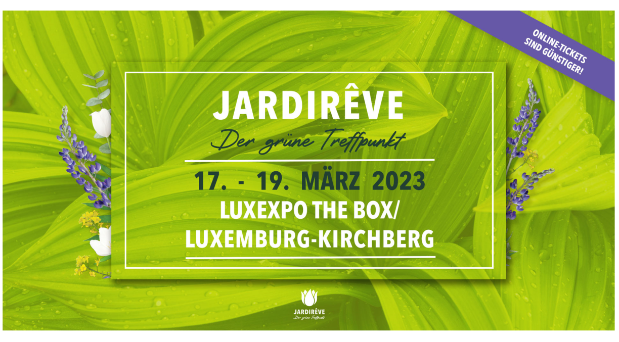 Wien gären am Gaart schafft, fir deen ass Jardirêve sécher ewell e Begrëff. Vun e Freideg bis e Sonndeg fannt Dir an der LuxExpo the Box d’Experte wann et em de Gaart, Blummen, Planzen, Maschinnen a Gaardegestalltung geet aus Lëtzebuerg, Däitschland an och Holland. Si presentéieren Iech déi neiste Produiten a weisen Iech déi neisten Tendenzen.