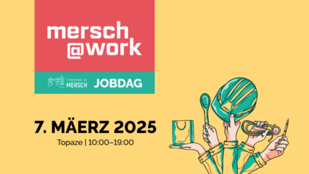 Dëse Freideg 07.03.2025 fënnt “Mersch at Work” am Topaze vun Moies 10 bis owes 7 Auer statt. Méi op mersch.lu