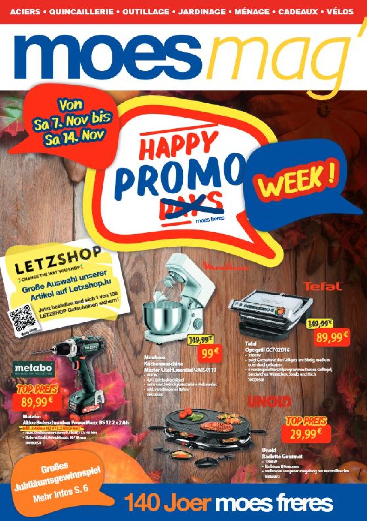 Moes Frères vu Réimech feieren dëst Joer hir 140 Joer, an d’Kaddoe si fir hir Clientèle. An dat am Kader vu ganz attraktive Promotiounen! Aus de Promo Days vu Moes Frères gouf duerfir eng ganz Promo-Week vum 7. bis de 14. November. Moes Frères ass jo Är Adress fir all Zort vu Stol, Quincaillerie, Handwierksgeschier, Gaarden- an Haushaltsartikelen, Kaddoen an alles ronderëm de Vëlo.