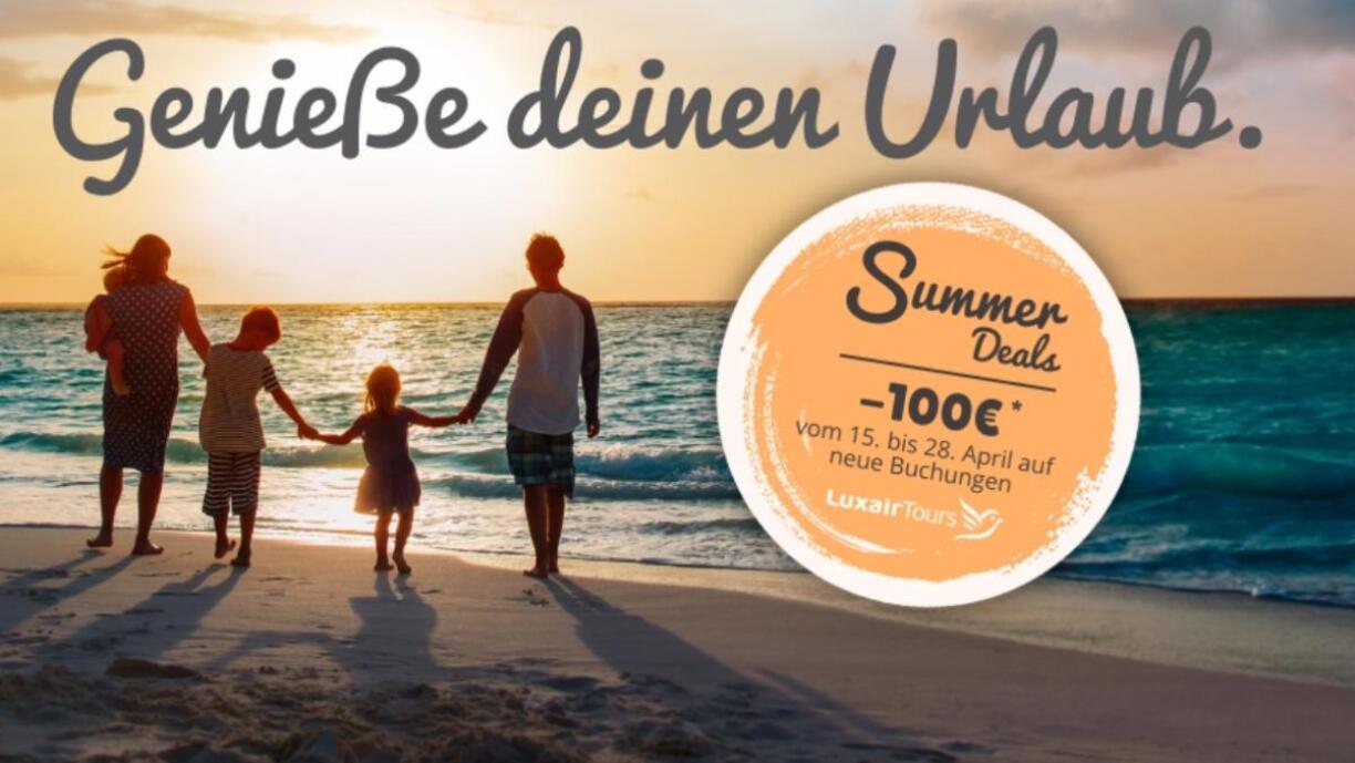 Bucht elo Är Summervakanz fir déi ganz Famill mat Luxair Tours a profitéiert bis Enn der Woch vun enger Reduktioun Am Wäert vun 100 Euro ob all Nei-Buchung.