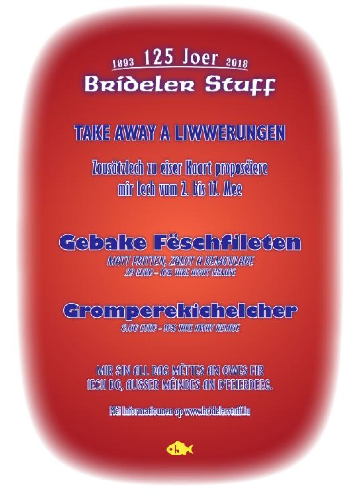 127 Joer méi spéit huet d’Équipe ronderem de Steve Pfeiffer sech och deser neier Erausfuerderung gestallt a sech komplett nei organsiéiert. Zanter dem éischten Dag vum Confinement proposéiere si en Take Away Service. Op bridelerstuff.lu fënnt een hir permanent aktualiséiert Kaart mat engem Choix, dee séngesgläiche sicht. Zum Beispill och elo gebake Fëschfileten a Gromperekichelcher wärend der Oktave bis de 17. Mee.
