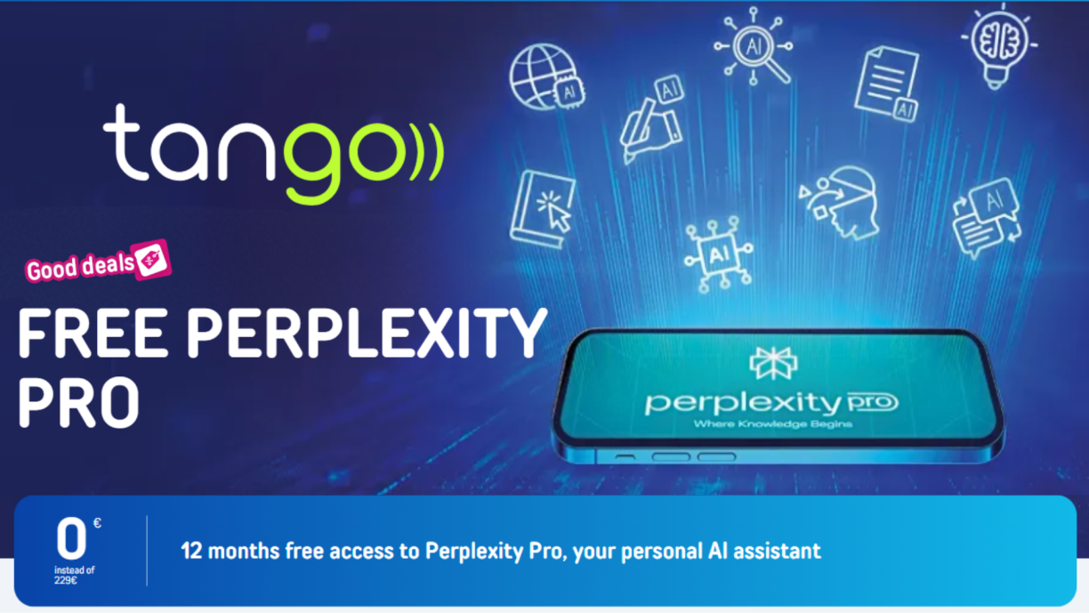 Tango offréiert senge ronn 285 000 Clienten 12 Méint gratis e Pro-Accès fir déi kënschtlech Intelligenz “Perplexity”, wat enger Valeur vun 229€ entsprécht.
