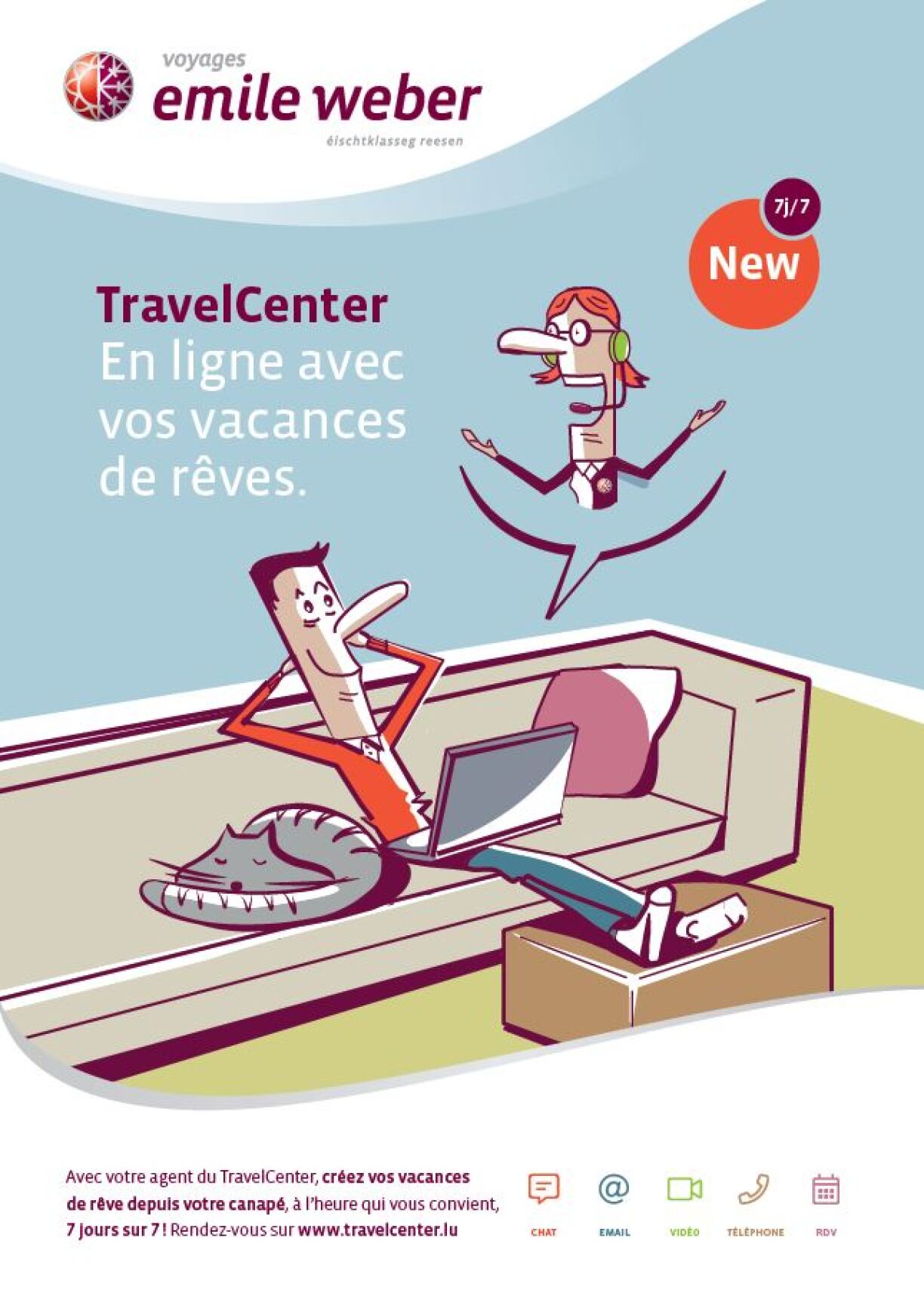 Den TravelCenter vu Voyages Emile Weber ass op vu méindes bis samsdes vun 9h00 bis 21h00 a Sonndes vu 16h00 bis 21h00. De Rendez-vous fir e Video-Livechat kann een also 7 Deeg op 7 ufroen iwwer travelcenter@vew.lu an um 20 80 40 – 1.