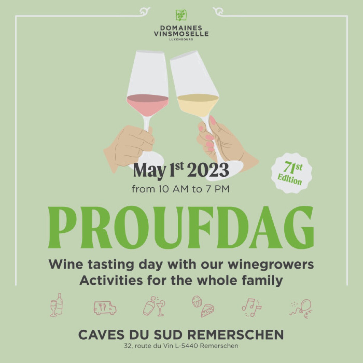 Um 1. Mee ass jo den traditionelle Proufdag, deen 71., vun den Domaines Vinsmoselle an de Caves du Sud zu Rëmerschen. Tëscht moies 10.00 an owes 19.00 kënnt Dir dann nees do déi beschte Wäiner vum Millésime 2022 aus de Vinsmoselle-Kellereien schmaachen an zu besonnesch gënschtege Konditioune kafen.