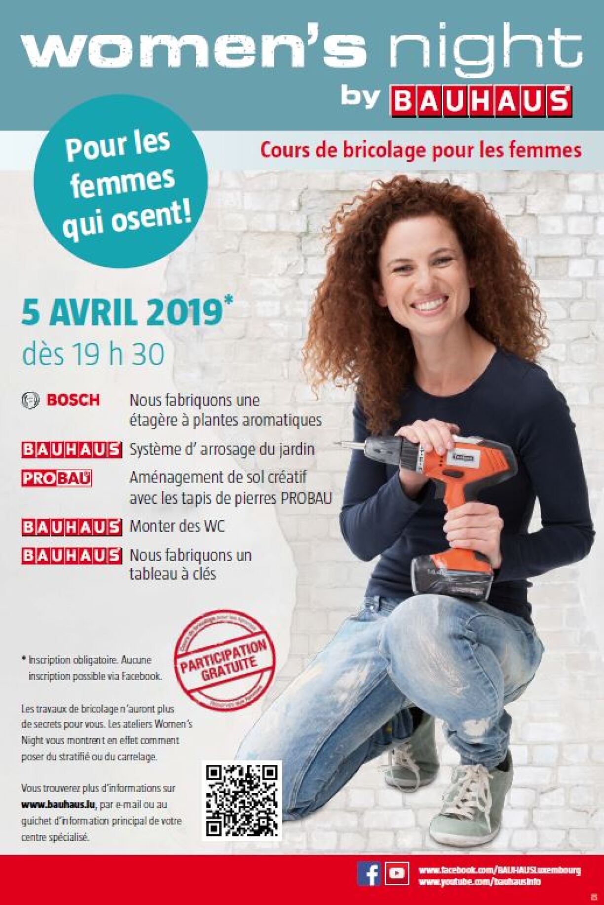 Dese Freideg 5.4. ass déi nächst „Women’s Night“ bei Bauhaus op der Cap. Schläifen, bueren, Dübelen, schrauwen, Plättercher leeën… - déi Coure sinn zanter Joeren immens beléift! A wéi den Numm et seet, adresséiert sech déi Soirée exklusiv un eis Dammen. Et ginn am Ganze 5 Couren ugebueden: mat Bosch gëtt e Kraiderregal gebaut, Dir kënnt mat Bauhaus léiere, wéi de Gaart richteg bewässert gëtt, Probau weist Iech eng kreativ Buedemgestaltung mat engem Teppech aus Steng, Dir kënnt eng Toilette montéieren oder e Schlësselbried bauen. Ee Fachberoder weist Iech fir d’éischt wéi et geet an da kënnt Dir selwer Hand uleeën. D’Participatioun un dese Couren ass komplett gratis, fir Iessen an Drenken ass beschtens gesuergt an Dir kënnt och nach an enger Tombola super Kadoe gewannen! Et geet e Freideg 5.4. den Owend um 19.30 lass an umelle kënnt Dir Iech bei Bauhaus op der Telefonsnummer 288 668 – 1. Et si schon iwwer 100 Dammen ugemeld, duerfir maacht Iech bäi…