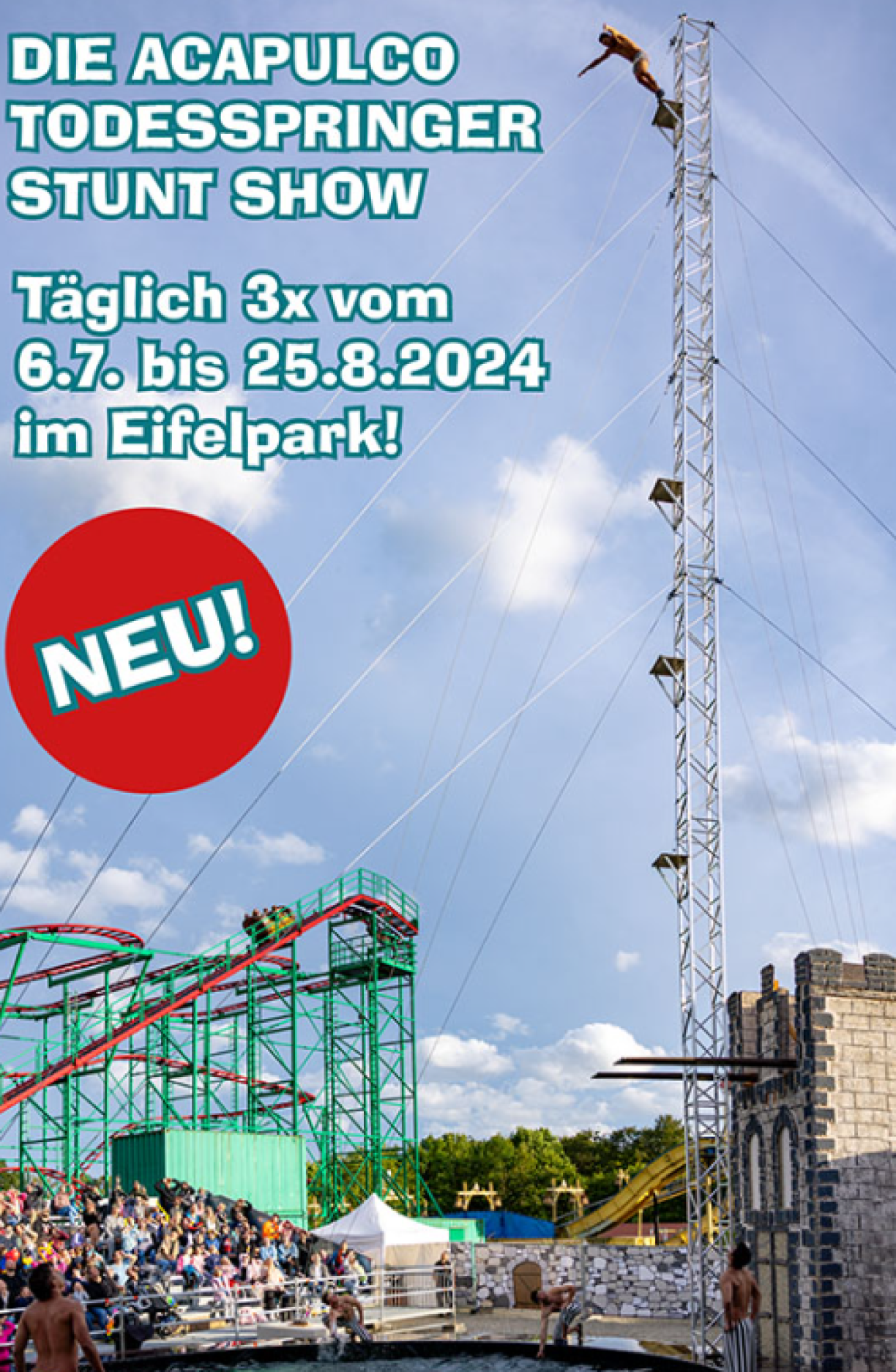 Déi gëtt et bis de 25. August dräimol den Dag! Erlieft d’Show live, wou couragéiert Artiste mat halsbriecheresche Stunts un d’Grenze vum Méigleche ginn. Héichpunkt vun der Show ass dann e Sprong aus 25 Meter Héicht.