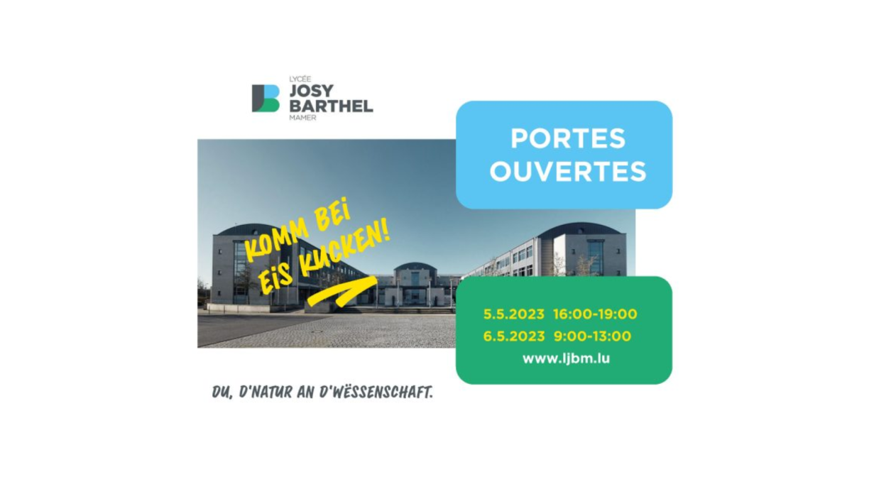 D’Porte Ouverte vum Lycée Josy Barthel zu Mamer ass de Freideg 5. Mee Nomëttes vu 4h00 bis 7h00 an de Samschdeg 6. Mee Moies vun 9h00 bis 12h30.