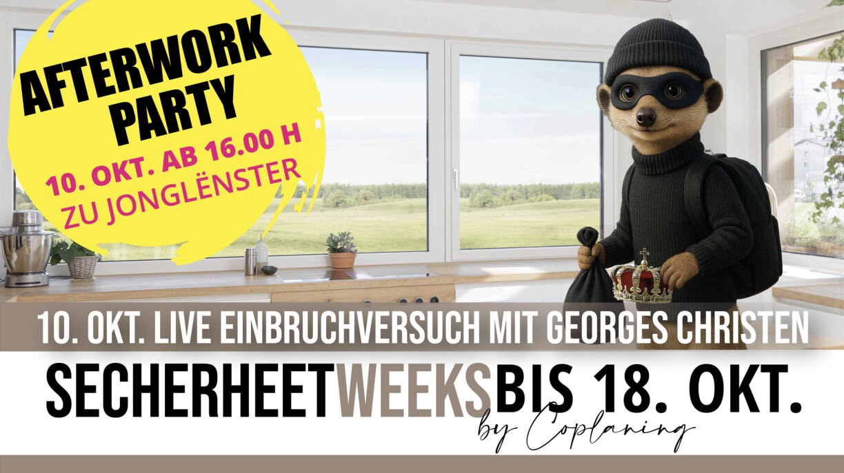 Den 10. Oktober 2025 um 16:00 starten si e live Abrochtest mam Georges Christen. Ob hien d’Coplaning Fënster opkritt? Gitt bis laanscht, fir Sécherheet nei ze erliwen.