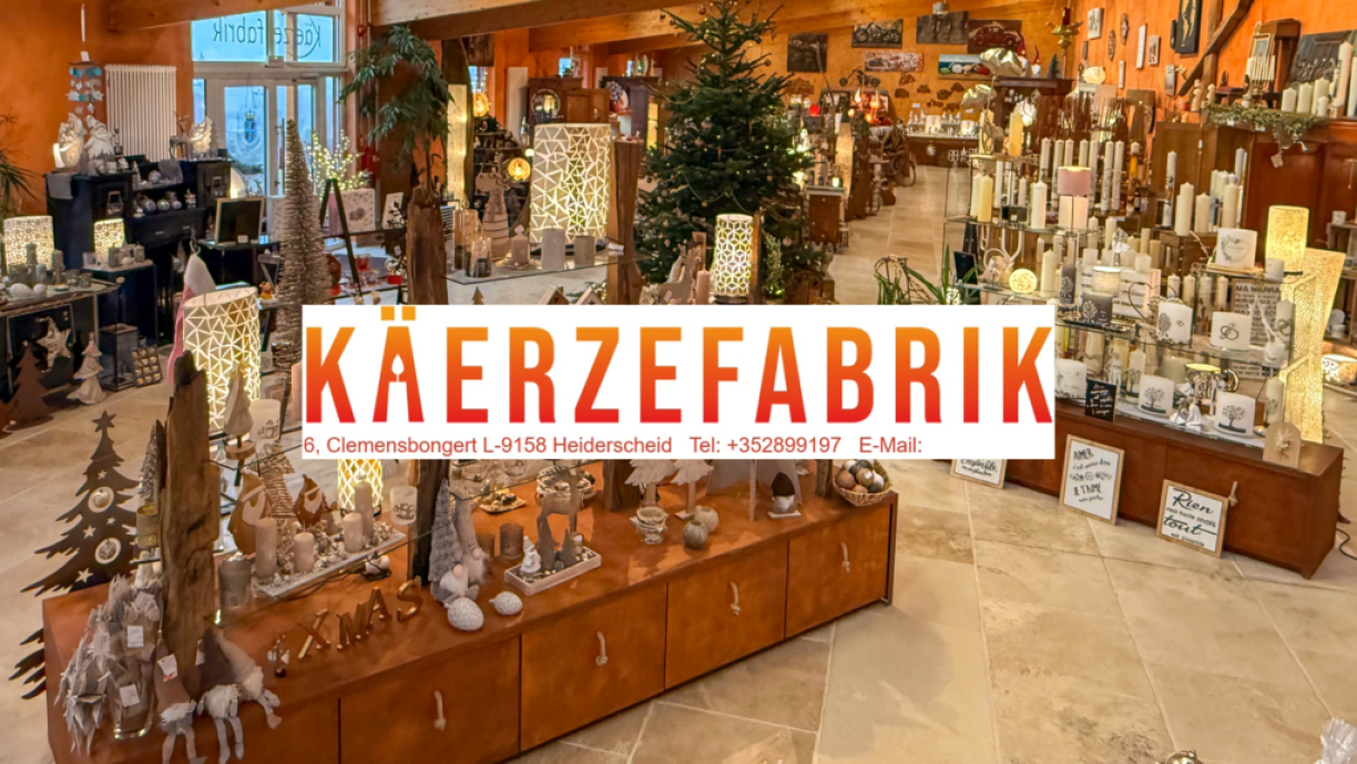 Wann dir eppes Besonnesches fir d’Chrëschtzäit sicht, dann ass d‘Käerzefabrik déi richteg Plaz. Ee Familljebetrieb zënter iwwer 30 Joer, wou Qualitéit an Handwierk grouss geschriwwe ginn. Hei fënnt ee Käerzen an alle Faarwen a Gréissten, flott Kaddosiddien an Dekoartikelen, Made in Luxembourg.