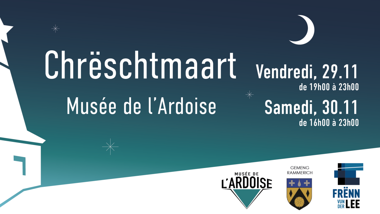 Dëse Weekend, e Freideg den 29. November an e Samschdeg den 30. November 2024 ass nees Chrëschtmaart zu Uewermaartel am Schiefermusée.