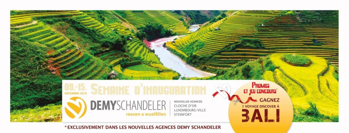 Gitt also bis laanscht an déi nei Agencë vum Demy Schandeler, profitéiert vun hiren exzeptionelle Promotiounen, a gewannt mat Chance och den Haaptgewënn: Eng Bali Discover Rees am Wäert vun 3500€!