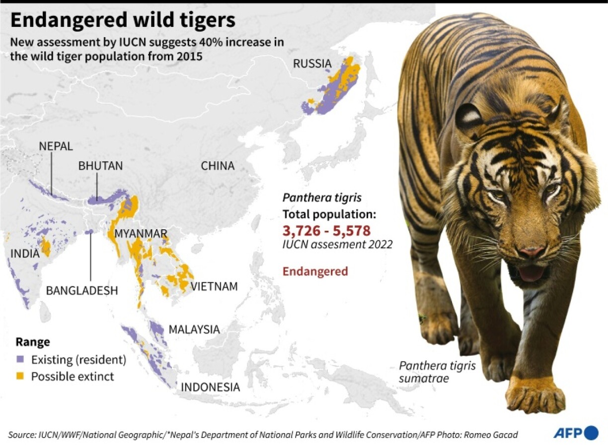 Der Weltnaturschutzunioun no liewen tëscht 3.726 a 5.578 Tigeren a fräier Natur an domat méi wéi bis ewell ugeholl. Déi nei Schätzung, déi ëm 40% iwwert der leschter Auswäertung am Joer 2015 läit, berout op enger verbesserter Iwwerwaachung vun der Populatioun. Tigere wiere virun allem duerch Wëlderen, de Verloscht vun hirem Liewensraum an engem ëmmer méi klenge Bestand u Beut a Gefor.