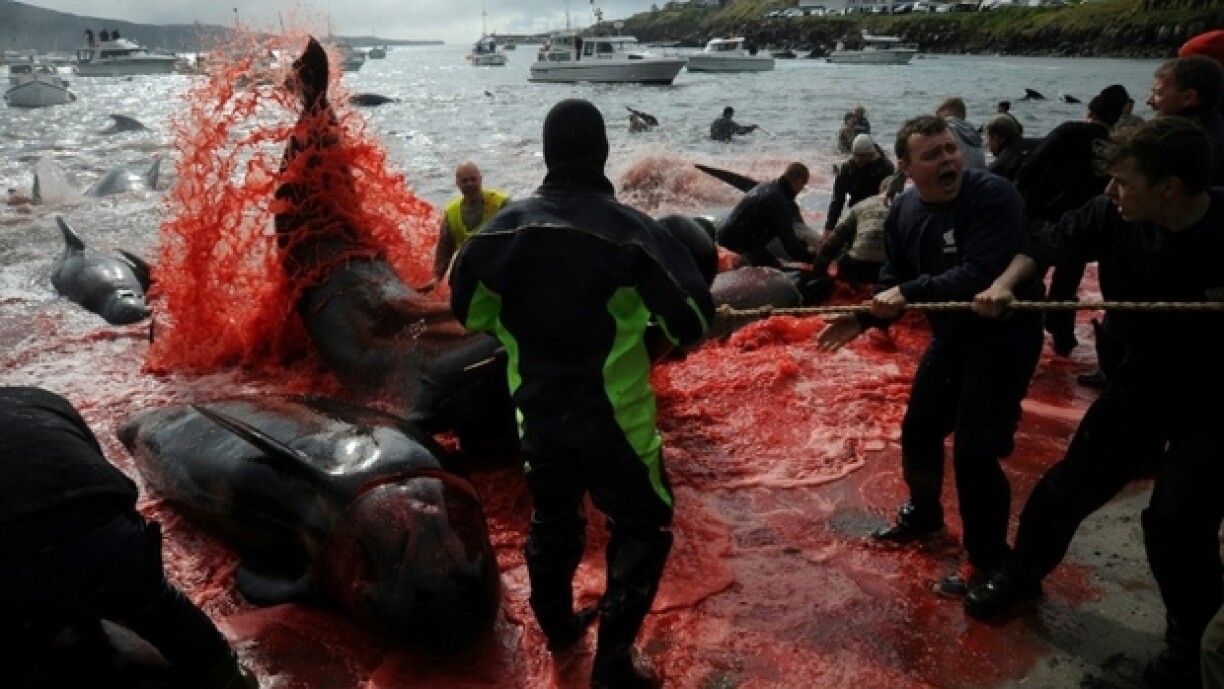 D’Fotoe vun deene bluddege Kadaveren um Strand hunn op den Online-Pattforme fir Opreegung gesuergt. D’Ëmweltschutzorganisatioun “Sea Sheperd” huet d’Praxis “barbaresch” genannt.