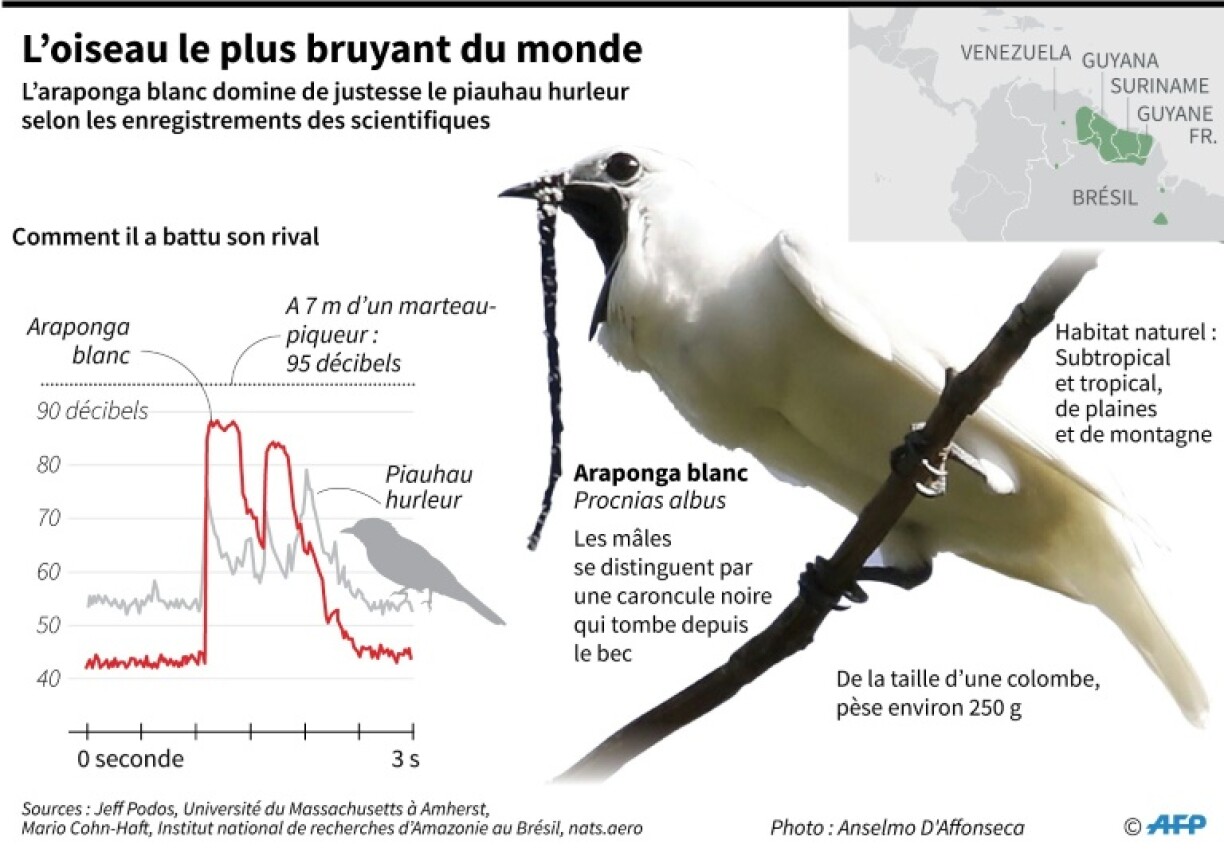 Mat engem spezielle Schallmiesser hunn d’Fuerscher d’Geräischer wärend vum Paarungsritual festgehalen an dobäi festgestallt, dass dëse klenge Vull esou haart Téin vu sech gëtt, dass se all déi aner Vullenaarten iwwertreffen. De “Procnias alba” - sou de wëssenschaftlechen Numm - päift 3 Mol méi haart wéi de Piha, deen och am Amazonas lieft a bis ewell deen häertste war.