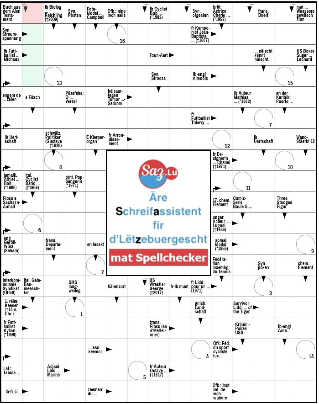 Dir wëllt d’Rätsel maachen? Klickt hei an Dir gesitt et grouss um Computer, Smartphone, Tablet ...Zesumme mam Linguist Jérôme Lulling hat RTL Iech am Summer 2016 4 Woche laang ëmmer donneschdes e KWR proposéiert, dat Dir gemittlech op Ärem Smartphone, Tablet oder Laptop léise konnt. Dat ass esou gutt ukomm gewiescht, datt mir weidergefuer sinn.