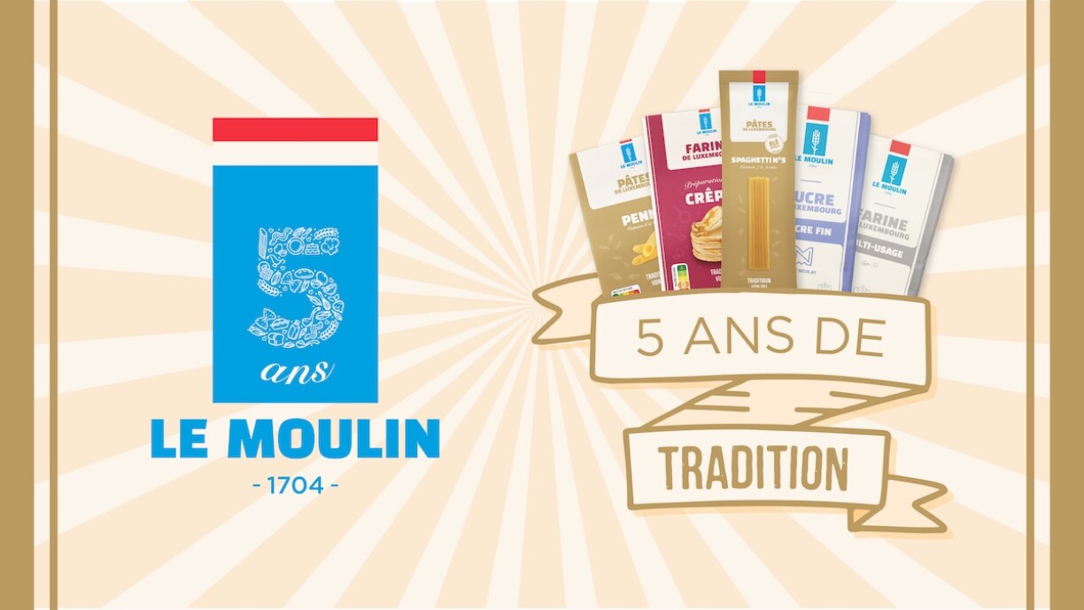 2025 feiert Le Moulin 1704 scho säi 5. Gebuertsdag. Mir soen all deene Merci, déi de Goût vun de „Geschichten, déi schmaachen“ deelen – an dat mat Iwwerraschungen a Kaddoen: eng Kichemaschinn, e relaxe Weekend an engem Hotel & Spa zu Lëtzebuerg, e kulinaresche Workshop, asw.