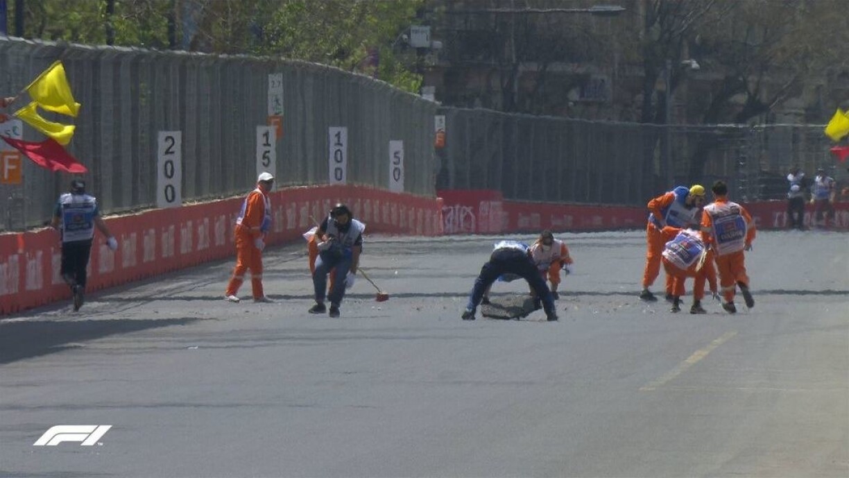 Rout Fändelen, Training ënnerbrach. De Williams vum George Russell steet op der Säit an huet vill Stécker verluer. Grond heivir war e Gullydeckel, deen net richteg fixéiert war a vum Williamspilot matgerappt gouf. Den Deckel huet dann och d’Gefier vum jonke britesche Pilot staark beschiedegt.