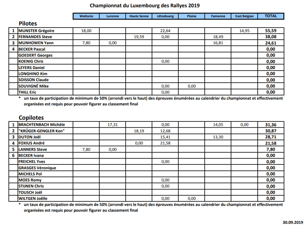 Am Reglement vum Rallye-Championnat steet geschriwwen, dass een op d’mannst u 50% vun den Epreuven aus dem Rallye-Kalenner muss deelgeholl hunn, fir eligibel ze sinn, an d’Wäertung vum Championnat ze kommen.