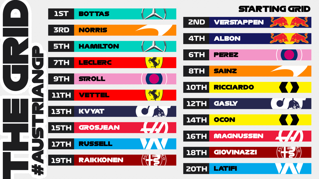 Un der Spëtzt waren et wéi erwaart d’Mercedes-Piloten, déi sech déi éischte Plazen um Depart séchere konnten. D’Pole zu Spielberg war um Enn fir de Vallteri Bottas, dee sech virum Hamilton behaapte konnt. Den Hamilton muss awer 3 Plazen no hannen, well hien wärend enger Giel-Phas net vum Gas gaange war. An enger éischter Decisioun war hien nach fräigesprach ginn... ma Red Bull huet neit Videomaterial virgewisen, wouropshin d’Stewards hir Decisioun geännert hunn. Den Hamilton muss also elo 3 Plazen no hanne réckelen a start also vu Plaz 5. Zweeten ass domat den Hollänner Max Verstappen, virum 20 Joer jonke Lando Norris op McLaren.