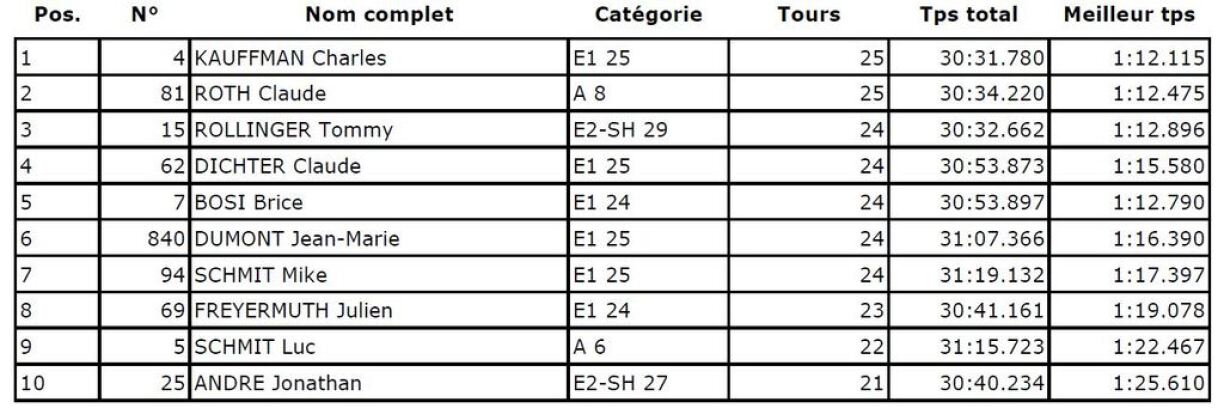 Déi 1. Course gouf vum Charles Kauffman (Porsche 996 Cup) gewonnen, virum Claude Roth (Cupra TCR) an dem Tommy Rollinger (Lamera).