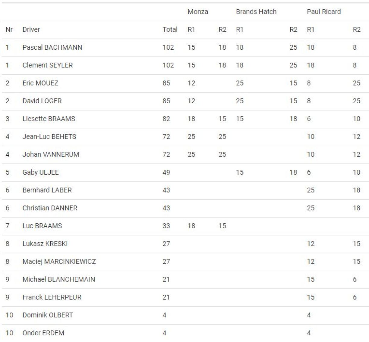 Trotz dësem Réckschlag um Sonndeg, stinn de Pascal Bachmann an de Clement Seyler an der AM-Wäertung no 3 Manchë vun de Blancpain European GT4 Series op der 1. Plaz, dëst mat 102 Punkten aus 6 Coursen.