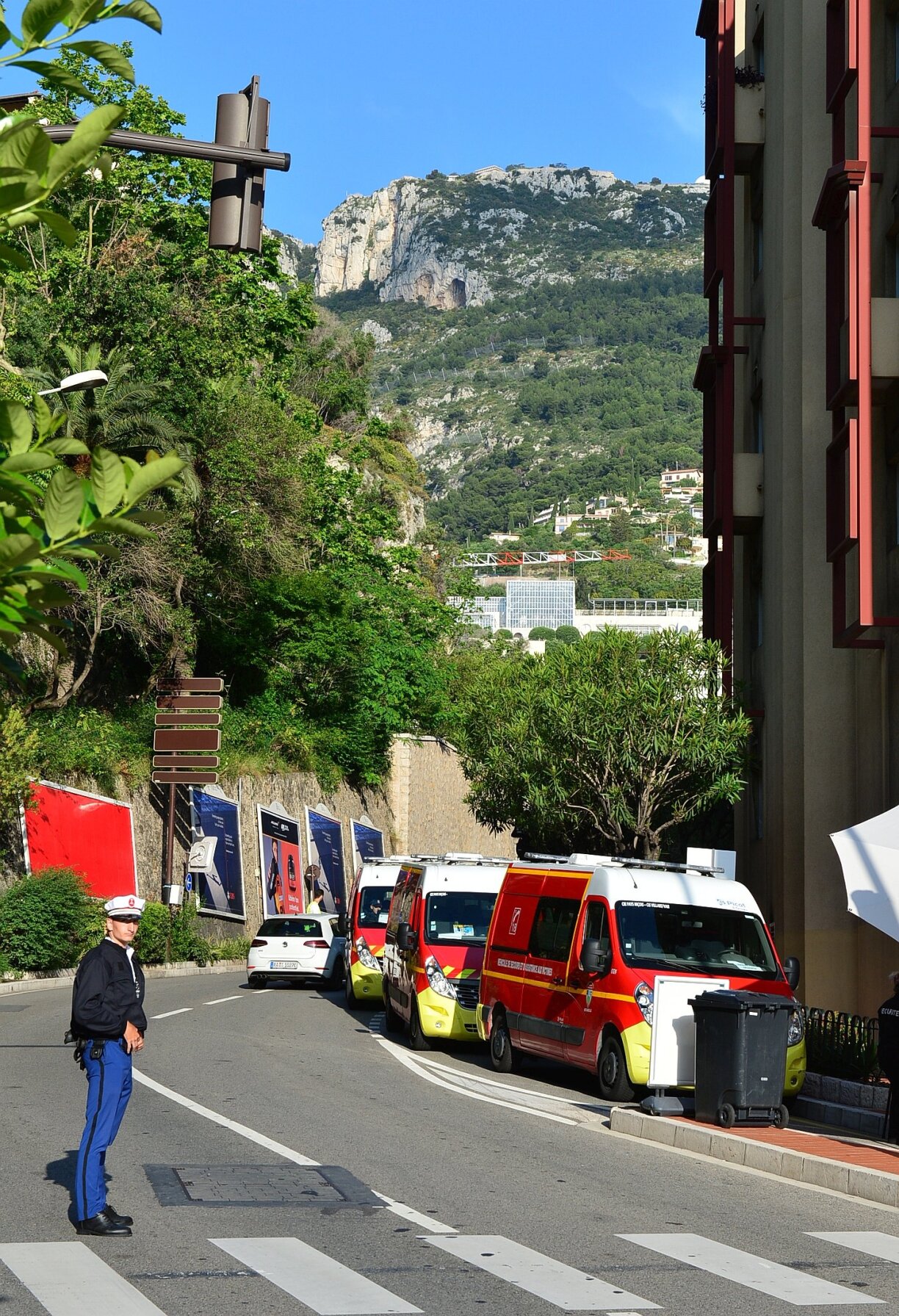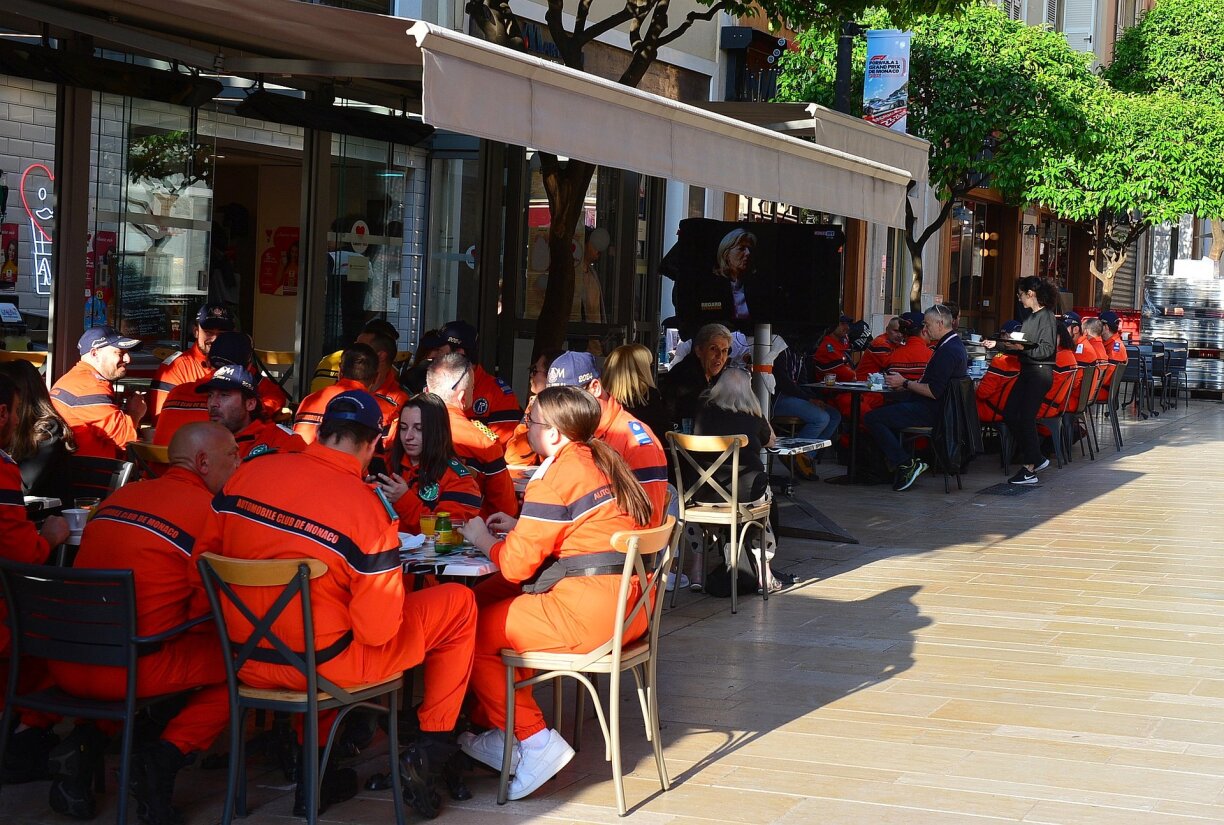Am Büro vum “ACM” Automobilclub de Monaco krut ech gesot, datt de Weekend vun der Formel 1 eng gutt 2.500 Kommissären a privat Leit sech ëm d’Sécherheet, de Contrôle an aner Mesurë këmmeren. Verschiddener vun hinne ginn esouguer all Joers virum Grand Prix nach emol frësch geschoult, an engem Stage iwwer zwee bis dräi Deeg. Di meescht Leit maachen dat Benevole, mee et ginn och Leit am medezinesche Beräich, oder Pompjeeën, déi dat berufflech maachen, also e Salaire hunn. Di monegassesch Pompjeeën hunn extrem flott Helmer un, déi och ëmmer e schéint Motiv fir eng Foto duerstellen.