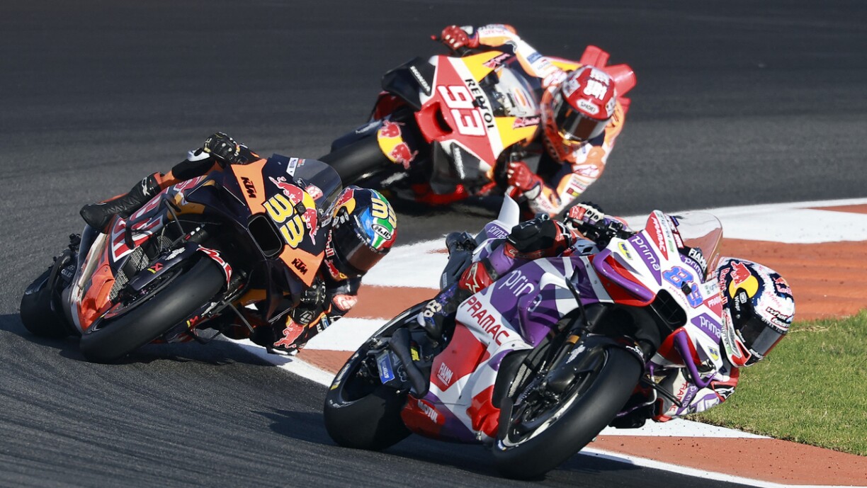 Den Zweeten aus der WM war am Modus Chute oder Victoire ënnerwee a koum mat Kampfspuere vum Marquez sengem viischte Pneu op der Kombi an der séierer 10 Kéier gutt laanscht de Binder. De blouf déi läscht 6 Ronnen zwar am hënneschte Pneu, ma krut kéng Platz fir eng Attack. Een emotionale Marc Marquez huet sech iwwert säin 3. Podium bei sengem leschte Sprint fir Honda gefreet. An de Francesco Bagnaia konnt op der 5 zefridde sinn, dat de Fabio di Giannantonio an de leschte Ronnen net nach eng Attack forcéiert huet. Esou muss de Jorge Martin am Grand Prix nach 14 Punkten ophuelen. Dat heescht dat och bei enger weiderer Victoire dem Pecco Bagnaia nach emol eng fënnefte Plaaz géing duer goen.