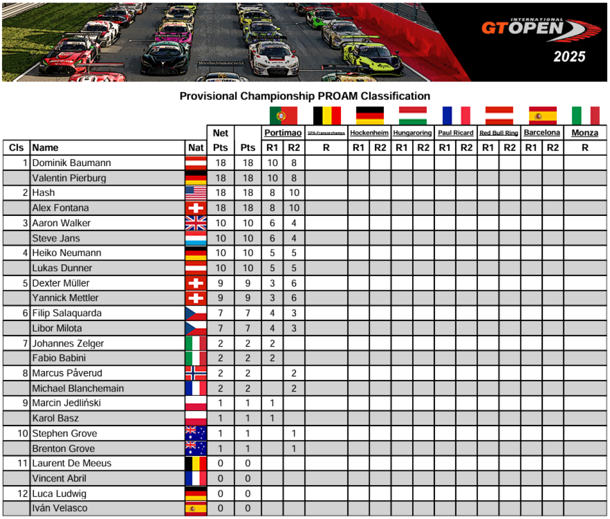 No dem éischte Renn-Weekend leien de Steve Jans an den Aaron Walker op Plaz 3 an der PROAM-Klass, dat mat 10 Punkten aus zwou Courssen.