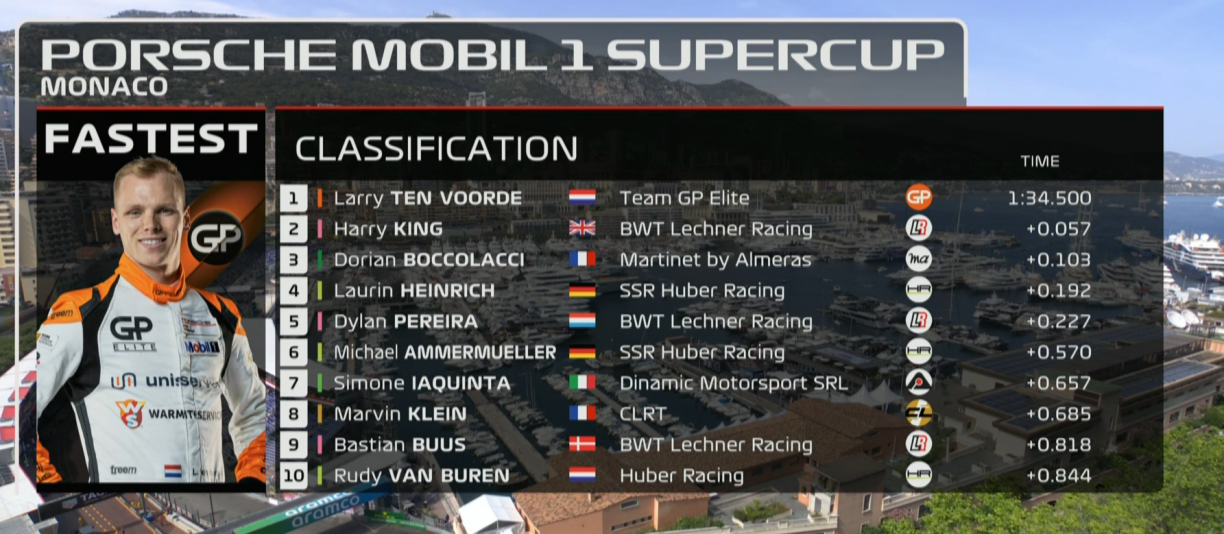 De Weekend gëtt am Kader vum Grousse Präis vu Monaco an der Formel 1 déi 2. Course vun der Saison am Porsche Supercup gefuer. E Freideg war schonn de Qualifying an hei ass et fir den Dylan Pereira net esou gutt gelaf wéi beim Optakt an d’Saison. Konnt sech de Lëtzebuerger zu Imola nach d’Pole Position sécheren, huet hie sech zu Monaco misse mat der 5. Plaz zefridde ginn. E Sonndeg geet de Lëtzebuerger awer als 4. an d’Course, datt well den Harry King, deen am Qualifying déi zweetséierst Zäit gefuer war, eng Strof krut an 3 Plazen an der Startopstellung zeréckversat gouf.