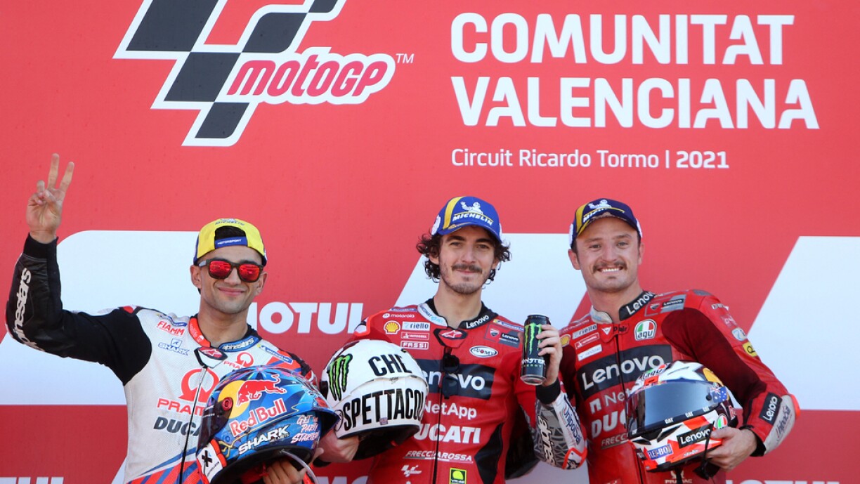 De MotoGP-Vizeweltmeeschter Francesco Bagnaia huet d’Saison 2021 zu Valencia mat enger Victoire ofgeschloss. Den Italiener huet sech virum Jorge Martin an dem Jack Miller duerchgesat. Domadder huet sech d’Wierksteam vun Ducati net nëmmen den Team-Weltmeeschtertitel geséchert, ma dierf sech och iwwert déi éischt Dräifachvictoire an der Geschicht vun der Motorrad-WM freeën. De Weltmeeschter Fabio Quartararo ass dee 5. ginn.