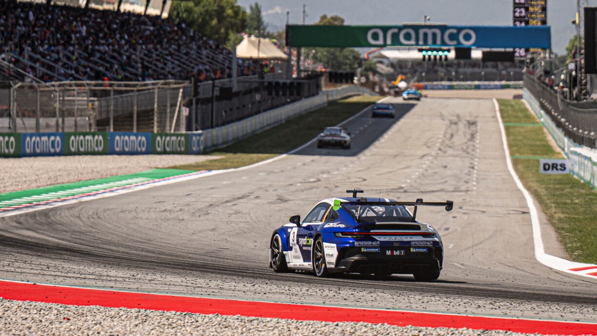 Dëse Mëssel sollt awer sengem Teamkolleeg Alessandro Ghiretti an d’Kaarte spillen. De Pilot aus dem Porsche Junior Programm huet direkt d’Spëtzt iwwerholl an d’Course a sengem Tempo duerchgezunn – vum éischte bis zum leschte Meter.