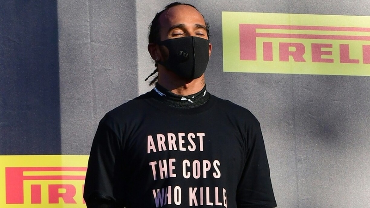 De Mercedes-Pilot hat e Sonndeg virun an no senger Victoire en T-Shirt u mam Sproch drop: “Verhaft d’Polizisten, déi d’Breonna Taylor ëmbruecht hunn”. Op der Récksäit vum Kleedungsstéck war eng Foto vum Doudesaffer ofgebillt an de Saz “Sot hiren Numm”.