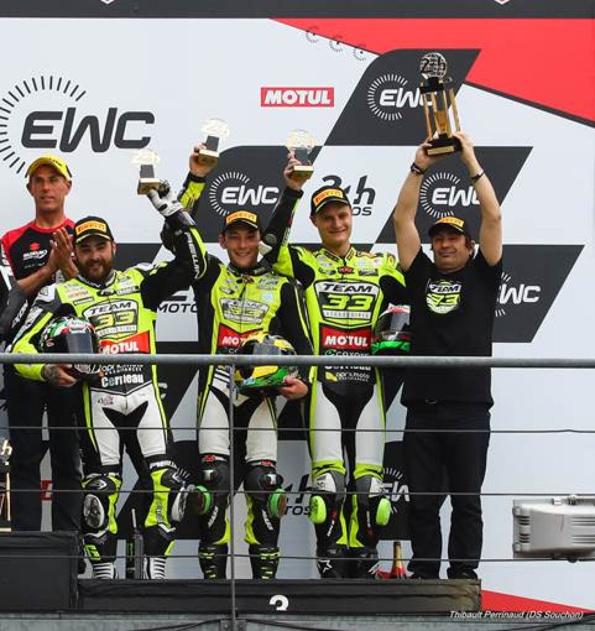 An der Kategorie “SuperStock”, ass et souguer déi exzellent 3. Plaz fir de Chris Leesch, den Enzo Boulom an de Kévin Manfredi op hirer Kawasaki ZX-10RR aus dem Team 33 Coyote Louit Moto.