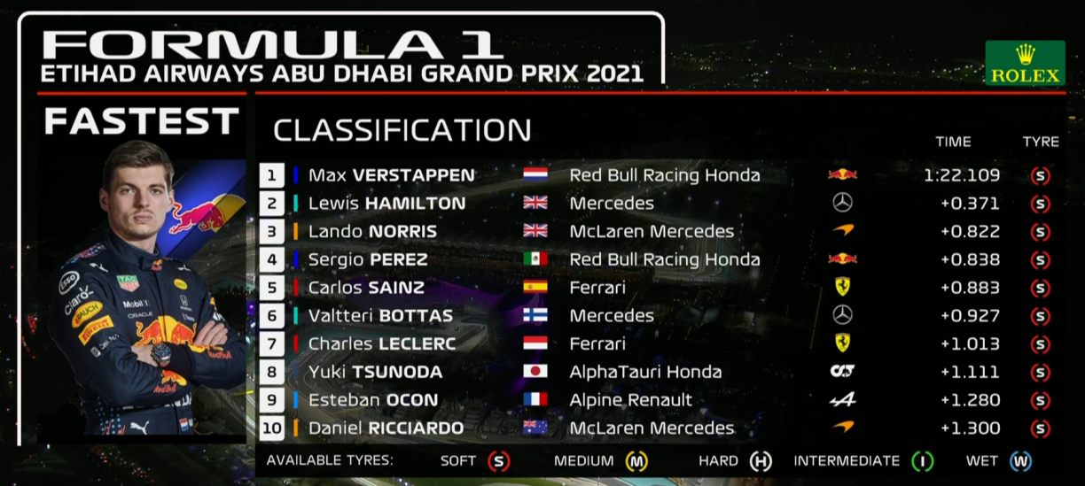 De Max Verstappen huet sech e Samschdeg am Qualifying fir de Grousse Präis vun Abu Dhabi d’Pole Position geséchert. De Red-Bull-Pilot huet sech viru sengem grousse Konkurrent Lewis Hamilton (Mercedes) behaapt. Aus der zweeter Rei fueren e Sonndeg de Lando Norris (McLaren) an de Sergio Perez (Red Bull) fort.