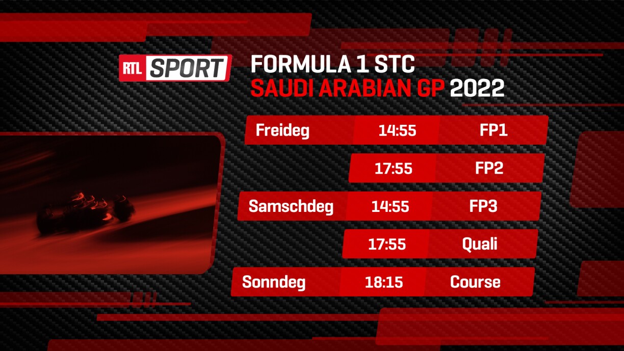 De Grousse Präis vun Saudi-Arabien mam Virprogramm fänkt e Sonndeg den Owend um17.45 Auer op RTL Zwee un. E Freideg den Owend ass de Qualifying op der selwechter Plaz um 18 Auer ze gesinn. Dat Ganzt an déi dräi fräi Trainingen e Freideg an e Samschdeg kënnt Dir och Live op RTL.lu an op RTL Play suivéieren.