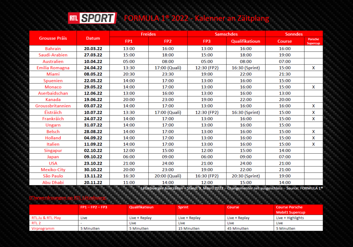 RTL-Artikel: Nei F1-Saison: nei Autoen, nei Piloten, nei Reegelen An och dës Saison kënnt Dir d’Formel 1 Saison mam Qualifying a mam Grand Prix nees Live bei eis op der Tëlee op RTL Zwee suivéieren. Dat Ganzt gëtt et och bei eis um Internet op rtl.lu an op rtlplay, wou dann och ëmmer d’fräi Trainingen ze gesinn sinn.