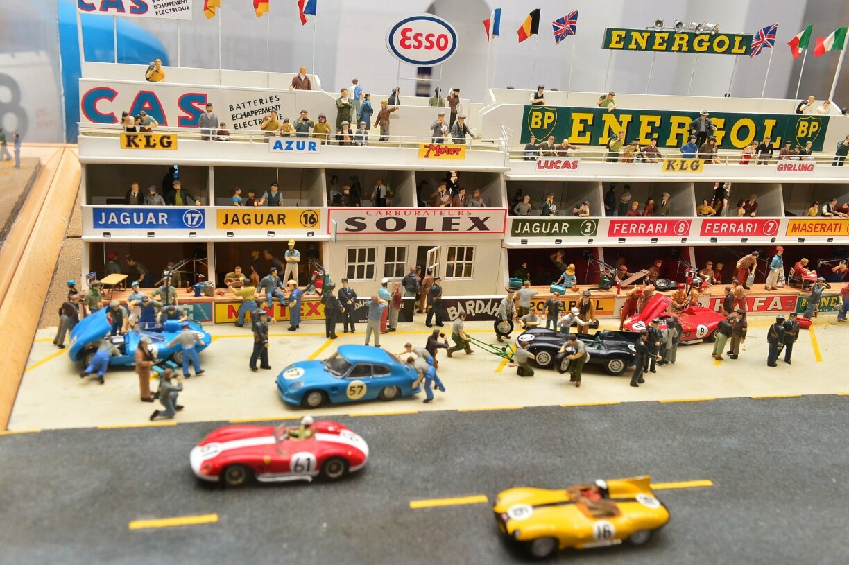 Eng Rei kleng Maquetten, déi d’Situatioun an der Boxegaass wärend de 24 Stonnen duerstellen, sinn tëscht den Autoen opgeriicht a stelle ganz real d’Hektik duer, déi deemools an och haut wärend engem Boxestopp an der Boxegaass ass.