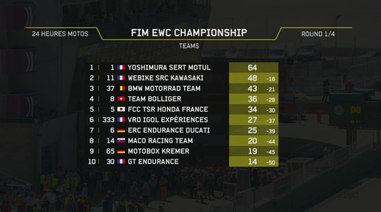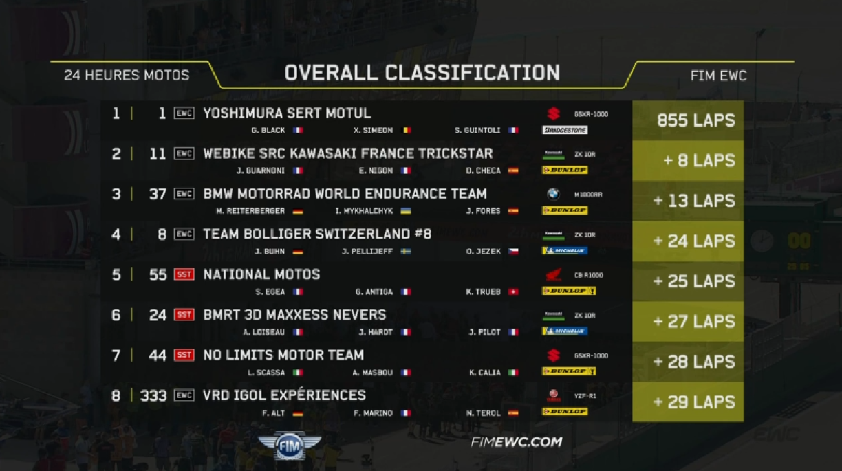 Besser hätt de Start an déi nei Endurance-WM-Saison fir de Weltmeeschter Suzuki net kënne sinn. D’Ekipp “Yoshimura Sert Modul” mam Xavier Simeon, Gregg Black a Sylvain Guintoli huet sech no enger staarker Leeschtung mat engem Virsprong vun 8 Ronnen d’Victoire bei de 24 Stonne vu Le Mans geséchert. Fir Suzuki war et schonn déi 13. Victoire beim Klassiker. SRC Kawasaki ass mam Jérémy Guarnoni, Erwan Nigon an dem David Checa eng onopfälleg Course gefuer. Um Enn ass fir d’Kawasaki-Wierksteam déi zweete Plaz erausgesprongen. Um Podium stoung nach d’BMW Motorrad World Endurance Team. No enger schlechter Ufanksphas mat der Chute vum Markus Reiterberger an Elektronikproblemer ass et um Enn awer nach fir déi drëtte Plaz duergaangen.