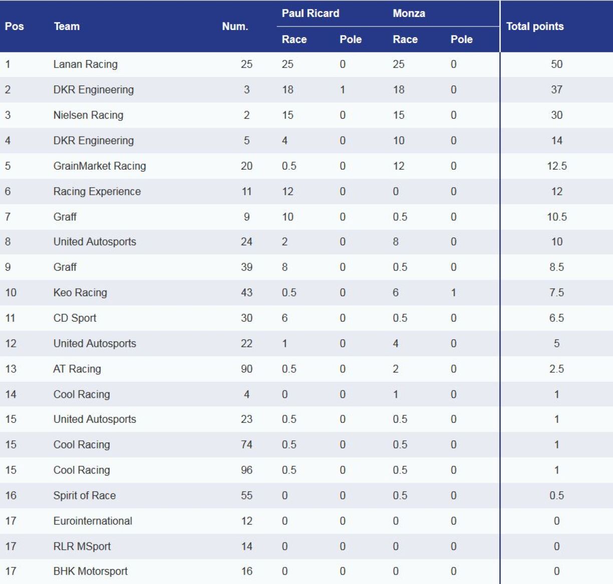 No den zwou éischte Coursen, läit Racing Experience iwwregens mat 12 Punkten op der 6. Plaz am General.
