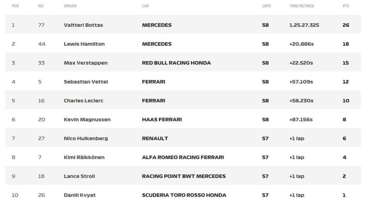 Um Enn gewënnt de Valtteri Bottas, dee sech zwou Ronne virun Schluss nach de Punkt vun der séierster Ronn séchere konnt, op Mercedes den éischten Groussen Präis vun dëser Saison. Hien hat zanter 2017 net méi gewonnen. Nieft him um Podium stoung säi Coequipier Lewis Hamilton an de Max Verstappen op Red Bull.