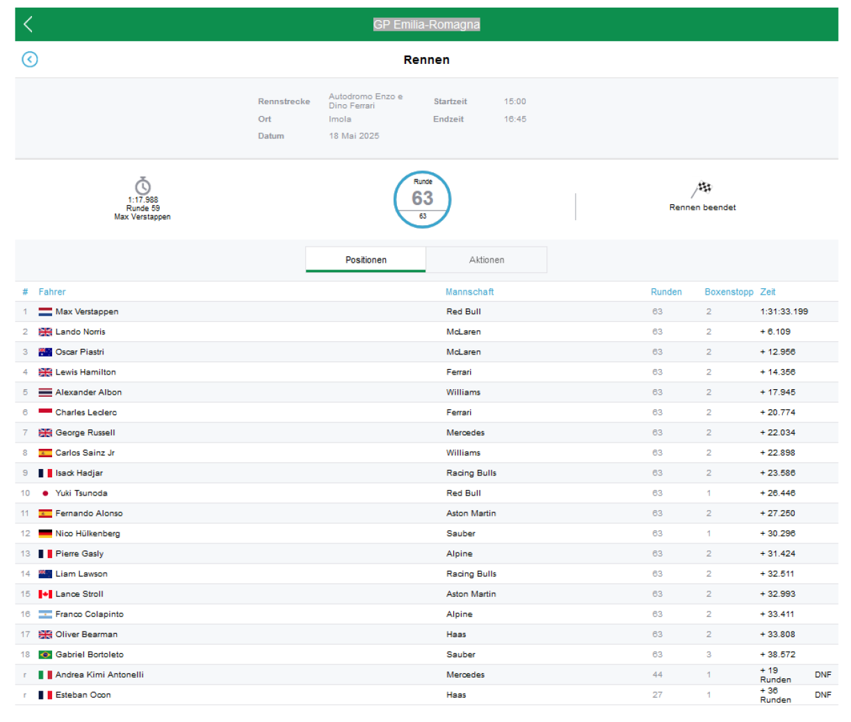 De Max Verstappen huet d’Dominanz vu McLaren aus de leschte Coursse gebrach an de Grousse Präis vun der Emilia-Romagna eng véiert Kéier gewonnen. Papaya muss sech zu Imola mat de Plazen 2 an 3 fir de Lando Norris an den Oscar Piastri zefridde ginn. Och Ferrari konnt sech no der desolater Leeschtung am Qualifying zeréckkafen a koum mat béide Piloten an d’Punkten. De Lewis Hamilton huet sech hannert dem Spëtzentrio agereit an de Charles Leclerc koum hannert dem Alexander Albon op Plaz 6. Déi reschtlech Punkte kruten den George Russell, de Carlos Sainz am zweete Williams, den Isack Hadjar an de Yuki Tsunoda.