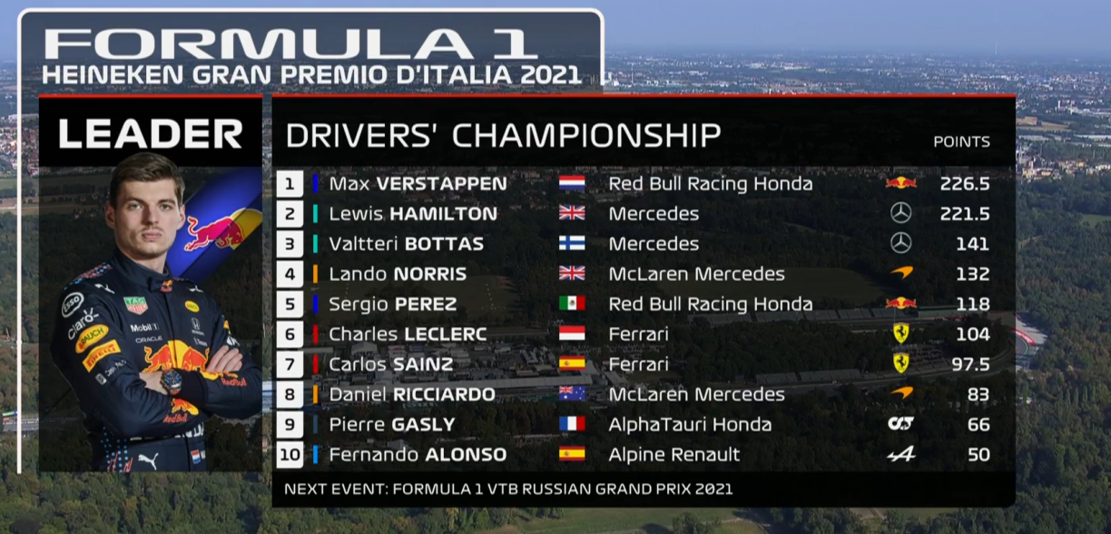Am WM-Klassement gëtt et domadder un der Spëtzt keng Verännerung. De Verstappen huet weiderhin eng Avance vu 5 Punkten op den Hamilton.