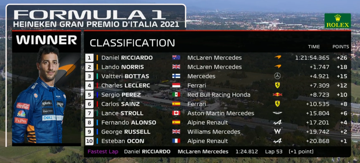 Zu Monza sinn nach den Norris an de Bottas op de Podium gefuer. Fir McLaren gouf et deemno en Doublé, den éischten zanter 2010.